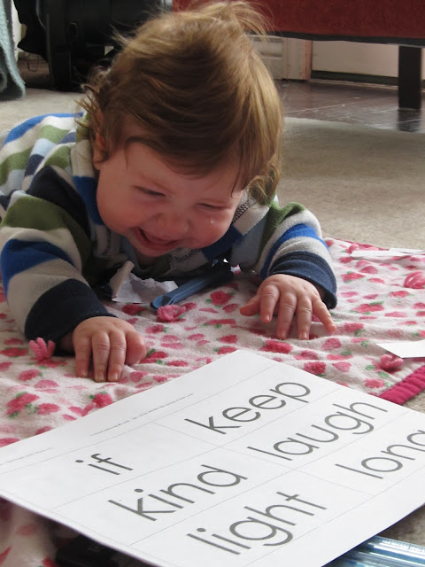 I have another progressive post (like this one, here). This time it's Sam vs. Lincoln's sight-word list. Boy, he wanted that list SO bad! He had to settle for scraps. Poor little photogenic fella.